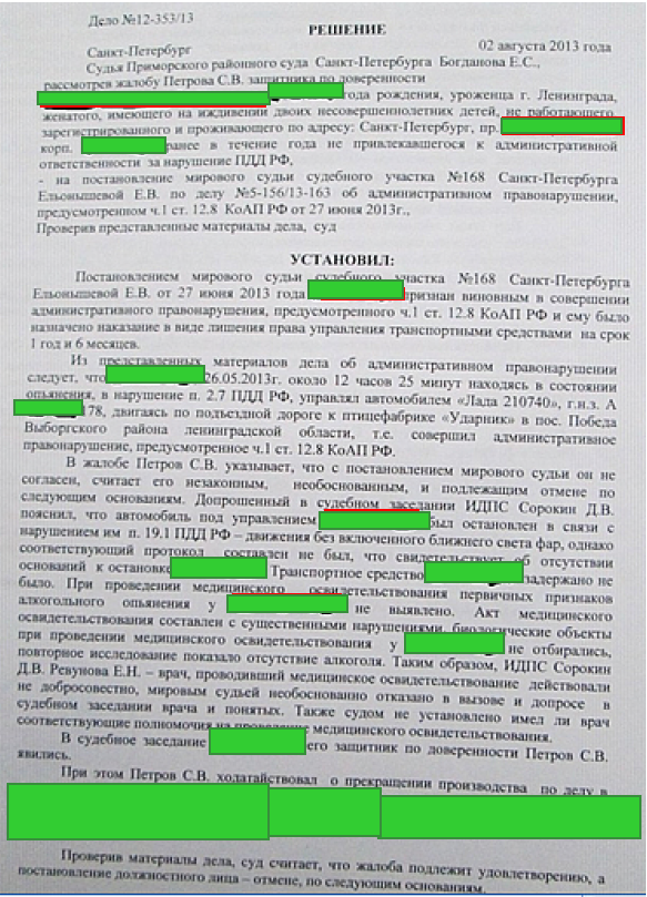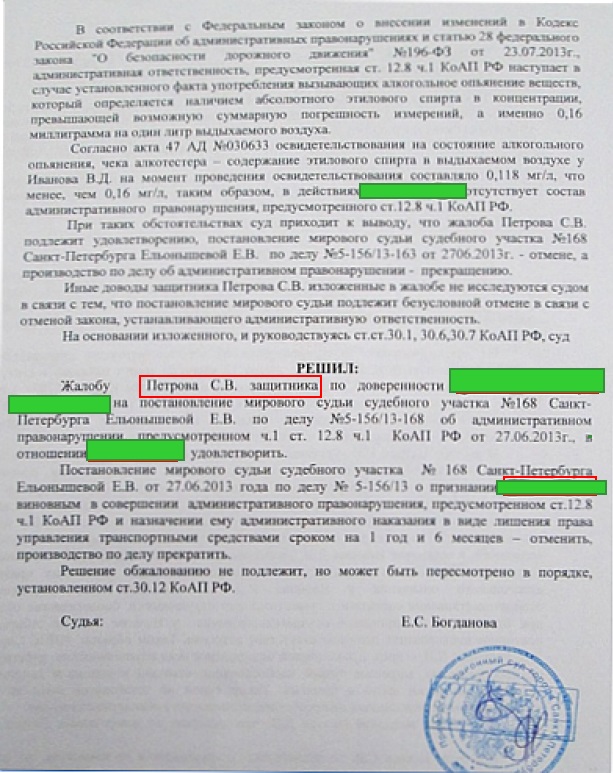 Адвокат подал жалобу в Приморский районный суд Санкт-Петербурга. Суд отменил решение мирового суда и вернул права водителю.