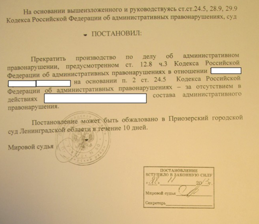 Мировой суд не лишил прав водителя по протоколам, составленным по ч.3 ст. 12.8 КоАП подчинёнными начальника ГИБДД ОМВД по Приозерскому району Ленинградской области Балдова А.А. Он огорчился и обжаловал постановление Мирового суда в Приозерский городской суд Ленинградской области.