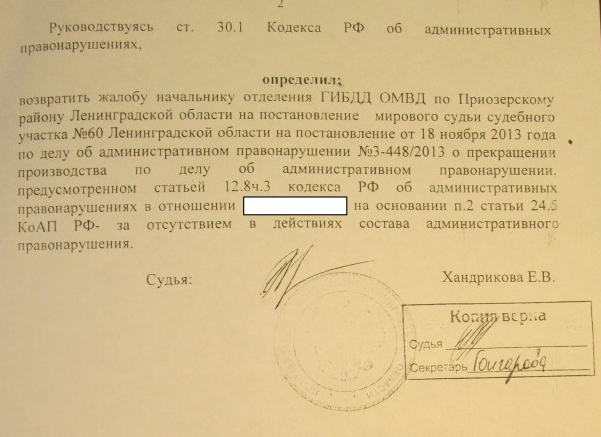 Городской суд, рассмотрев жалобу, решил вернуть её обратно в ГИБДД Балдову А.А. Тем временем, постановление Мирового суда вступило в законную силу. Обжаловать вступившее в законную силу решение суда в порядке надзора сотрудники ГИБДД уже не могут, т.к. это не не предусмотрено законом. Таким образом водитель отстоял свои права.