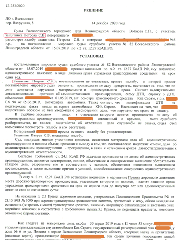 Адвокат по ДТП Петров С.В. подал жалобу в Всеволожский городской суд Ленинградской области. Решением судьи постановление мирового суда было изменено. Суд исключил из числа допустимых доказательств объяснение Потерпевшего, протокол осмотра транспортного средства и фотографии транспортного средства после ДТП. В остальной части постановление оставил без изменения. При этом, суд сослался на иные доказательства, доказывающие вину Водителя, не приведя их.